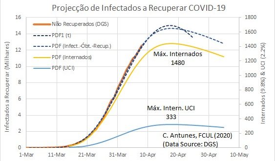 Baseado no número acumulado de infectados, de óbitos e de recuperados, com a aplicação da mesma metodologia de modelação numérica, é possível estimar a curva dos infectados activos ou não-recuperados. Modelando as funções acumulativas dos infectados, óbitos e recuperados, obtemos, pela diferença, uma estimativa de projecção da curva epidemiológica dos infectados não-recuperados. E com a percentagem média dos últimos 5 dias do número de internados e de CI, em relação ao número dos não-recuperados, obtemos uma estimativa da curva dos internados e CI. Com um pico para o número de Não_Recuperados definido entre 16-Abr e 27-Abr, estima-se um máximo de internados na ordem dos 1500 e na ordem dos 335 de CI, a atingir perto de 20 de Abril. Estes serão os próximos picos a ultrapassar, a partir dos quais começaremos a sentir, assim se espera, um alivio nas unidades hospitalares do país.
