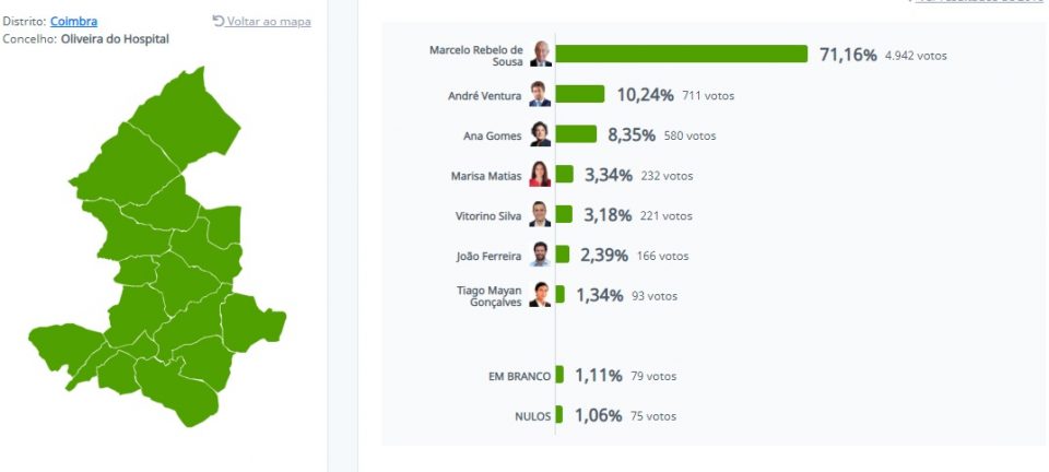 Marcelo Rebelo de Sousa foi hoje o candidato mais votado em Oliveira do Hospital nas eleições presidenciais, vencendo na totalidade das 16 freguesias do concelho oliveirense. O reeleito Presidente da República conseguiu 71,16 por cento dos votos (4942), deixando em segundo lugar André Ventura que conseguiu 10,24 por cento da votação (711 votos), superando Ana Gomes (terceira classificada) em onze fregesias. Dos 17 631 inscritos, 7099 oliveirenses foram hoje à mesa de voto, sendo a abstenção de 59,74 por cento. Ana Gomes superou André Ventura em duas freguesias. Na freguesia de Lourosa, Vitorino Silva ficou em terceiro lugar, logo a seguir a André Ventura.