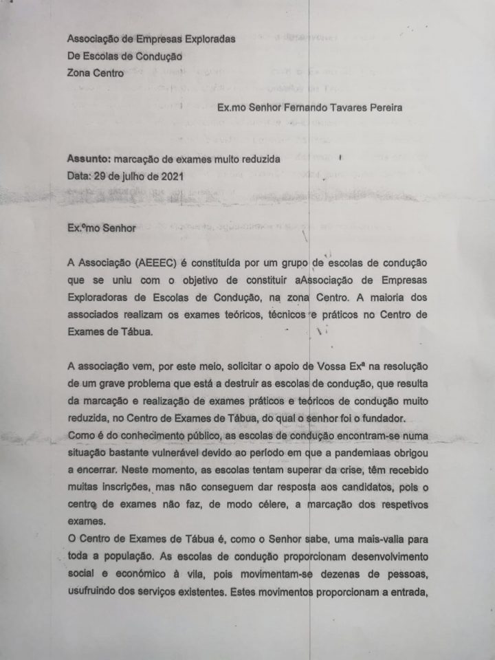 Em risco com a presente situação está a possibilidade de as escolas de condução deixarem de realizar as provas práticas e teóricas no Centro de Exames de Tábua, passando a serem feitos em outros centros com todas as consequências económicas que isso acarreta para o Município e a eventualidade do desaparecimento do mesmo.