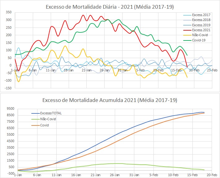 “99% do Excesso de Mortalidade em 2021 corresponde à letalidade Covid” explica o professor e investigador da Faculdade de Ciências da Universidade de Lisboa, o oliveirense, Carlos Antunes. “À data de 18-Fev, 8849 óbitos com Covid-19, para 8939 óbitos de excesso de mortalidade relativamente à média de 2017-2019. Até ao dia 18-Fev, em 2021, morreram 28724 pessoas, contra 19785 óbitos registados em média entre 2017 e 2019”, explica
