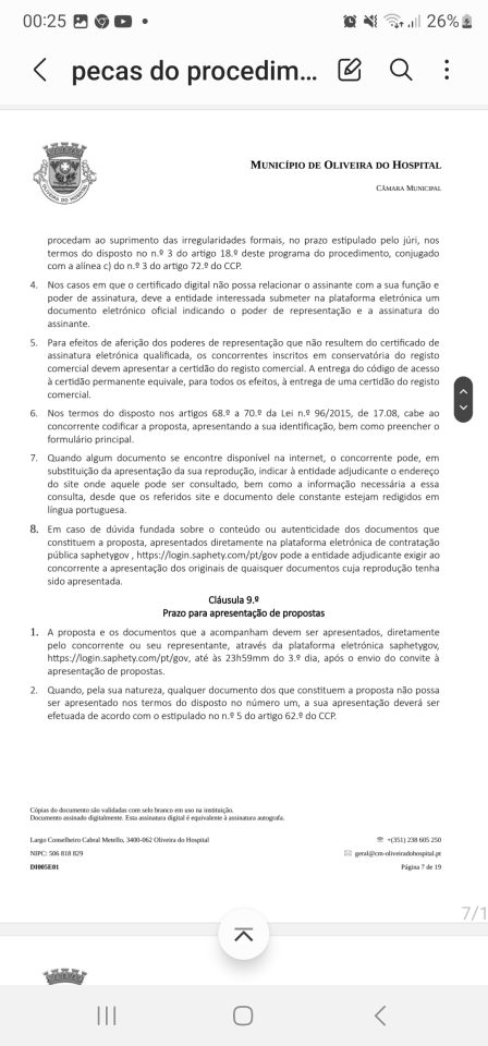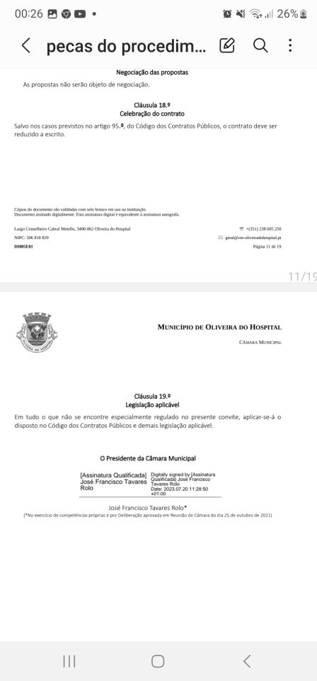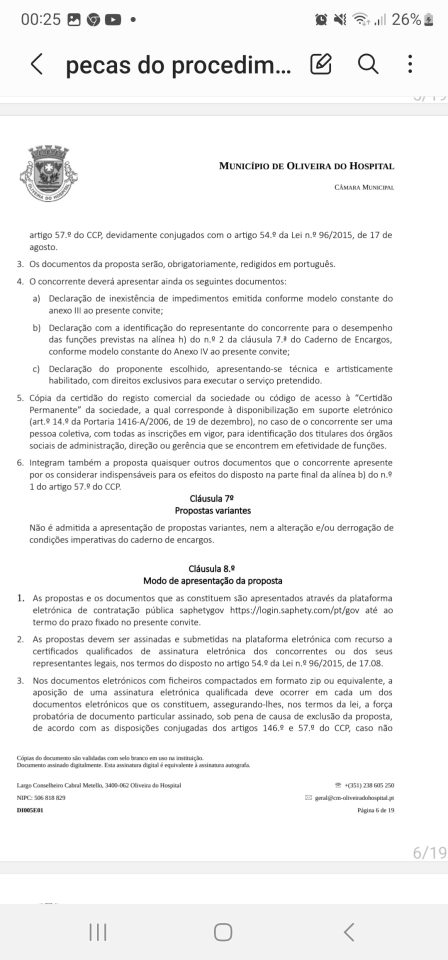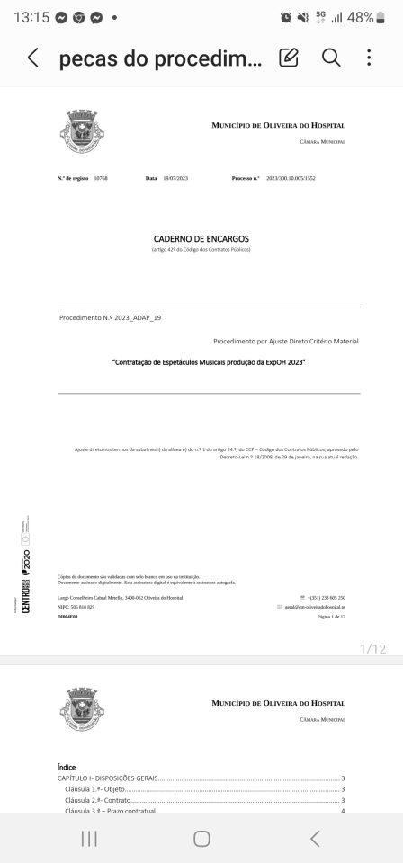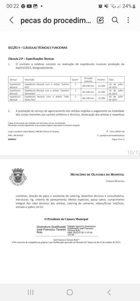 Ora verificamos que o caderno de encargos do procedimento para concurso de aquisição dos espectáculos dos três artistas, e dizem-se os três porque no caderno vem especificamente a pedir cotação para os três músicos mencionados, só surge a 19 de Julho. Esse documento foi assinado pelo Presidente do Município no dia seguinte e dá como prazo de três dias para apresentação de propostas, ou seja, até dia 23 de Julho de 2023 (domingo), considerando que o convite só foi enviado após a assinatura do Presidente (dia 20).