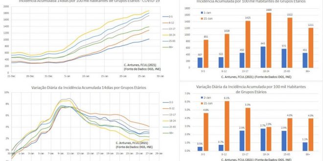 Em particular, o grupo etário dos 6 – 12 anos (1º e 2º ciclos) apresentava a 21 de Janeiro uma taxa de aumento diário da incidência de 6.1%. Com esta taxa, e caso se mantivesse, este grupo duplicaria o nº de casos a cada 11 dias. E à data de 27 Janeiro este grupo era o único que ainda apresentava uma taxa de aumento acima de 4%/dia.