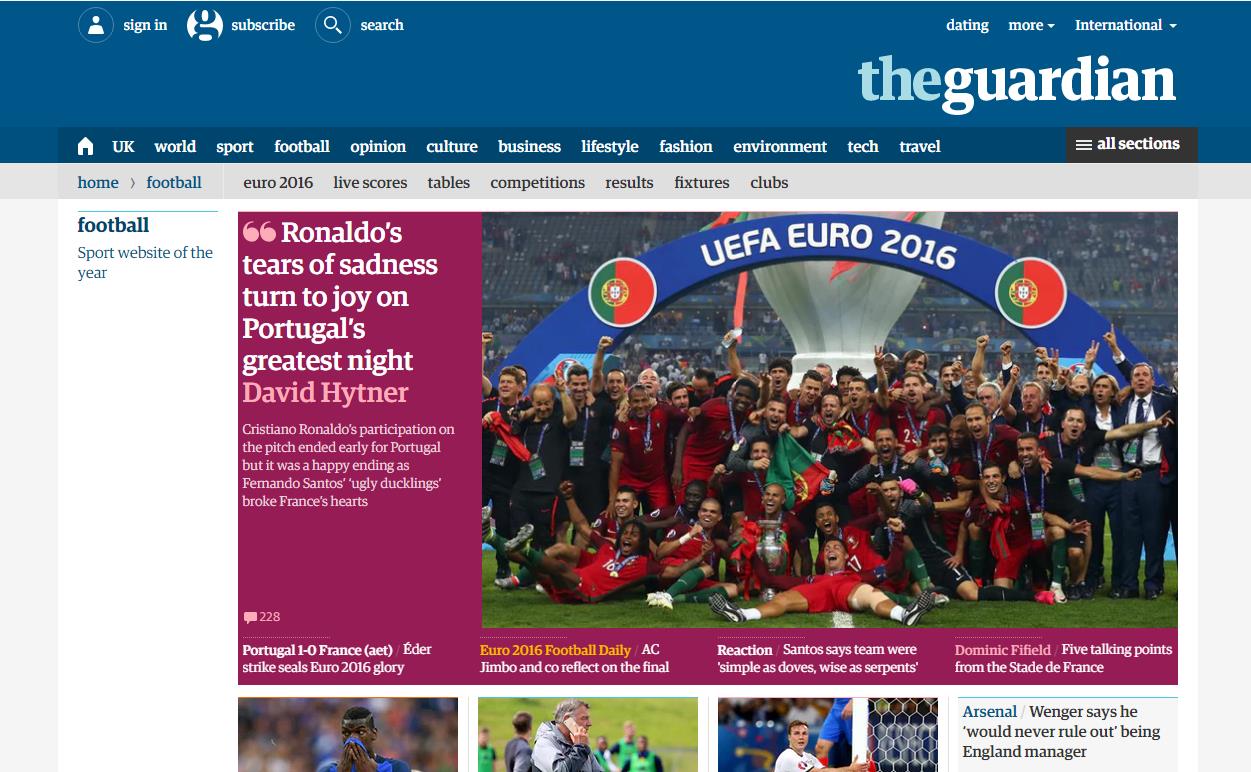 “Éder! Éder! Foi ele o herói português. Com Cristiano lesionado a chorar na maca, o protagonista mais inesperado apareceu na segunda parte do prolongamento para negar a França a glória na sua própria casa.”