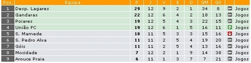 Quem continua firme na liderança da 1ª Divisão, Série A, da Associação de Futebol de Coimbra é a Associação Desportiva de Lagares da Beira que dista sete pontos do Gândaras, segundo classificado. No domingo goleou em casa o S. Mamede por 5-0. Na jornada 14, marcada para 8 de Janeiro, a equipa de Lagares da Beira defronta o Arouce Praia, equipa última classificada com apenas 6 pontos.