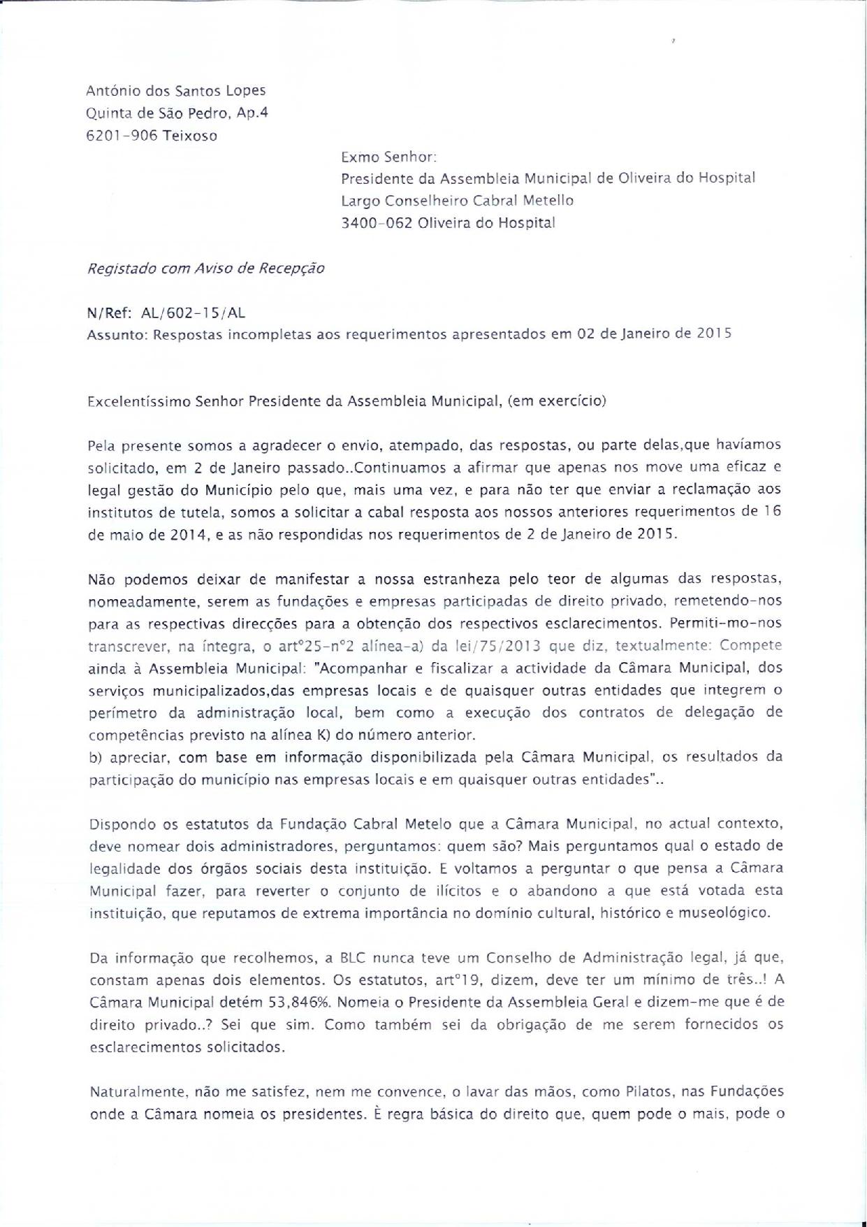António Lopes acusa ainda José Carlos Alexandrino, por exemplo, de não justificar os ajustes directos refugiando-se na lei, esquecendo que nestes casos existe a recomendação de apenas se recorrer a este tipo de contratação com razões fundamentadas. Salienta ainda que, noutras questões o remeteram para as direcções das várias instituições, o que na prática “é uma forma de não responder”. “É que eu só posso pedir esclarecimentos através da mesa da AM. São eles que têm que arranjar os documentos. Ao fim de cinco anos e meio de mandato o Sr. Presidente da Câmara já tinha tempo de conhecer a lei e saber que os membros da Assembleia, nos termos do nº2 alínea e) do Regimento e da do artº25 nº2 alínea e) da lei 75/2013, pedem os esclarecimentos através da mesa da AM”, clarifica.