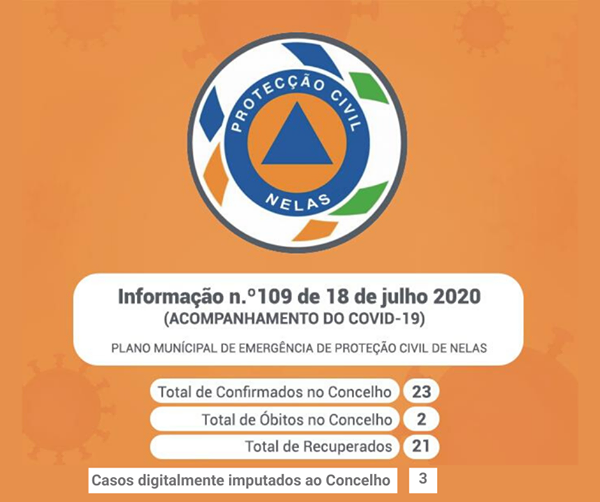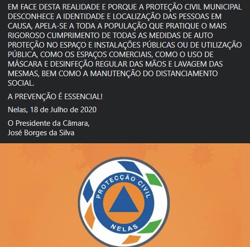 Desejando que as pessoas doentes tenham rápida recuperação (podendo contactar os Serviços Sociais e de Protecção Civil do Município em caso de necessidade para todo o auxílio que necessitarem – contactos esse disponíveis no Site “Município de Nelas”), o presidente da autarquia diz que não podia deixar de comunicar a toda a população do Concelho de Nelas que existem no município neste momento três casos de cidadãos diagnosticados com COVID-19 positivos.