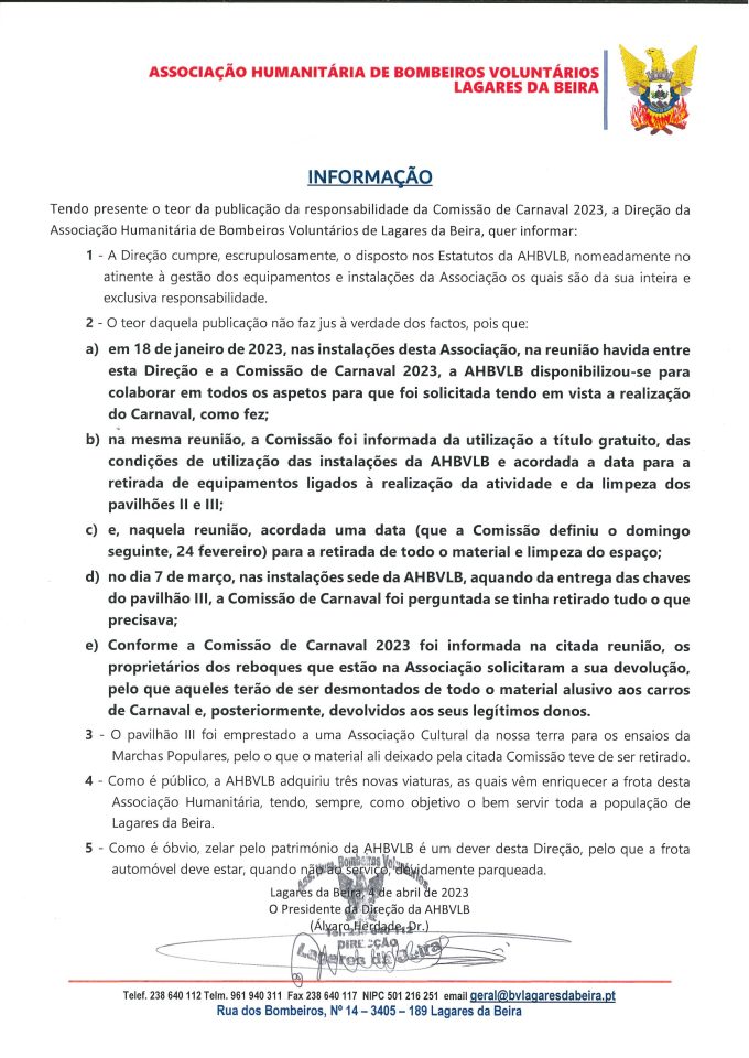 “A Direcção cumpre, escrupulosamente, o disposto nos Estatutos da AHBVLB, nomeadamente no atinente à gestão dos equipamentos e instalações da Associação os quais são da sua inteira e exclusiva responsabilidade”, reforça aquela entidade, salientando que colaborou em tudo o que lhe foi possível para a realização do Carnaval de 2023 em Lagares da Beira.
