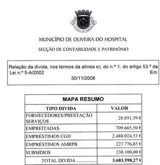 De acordo com a documentação distribuída aos deputados municipais e a que este diário digital teve acesso, a dívida do município ascendia em, 30 de Novembro deste ano, a 3.683.598,27 milhões de euros.
