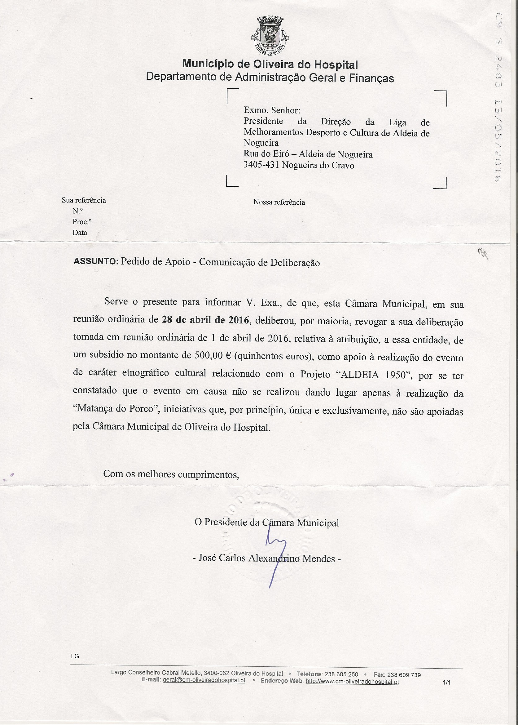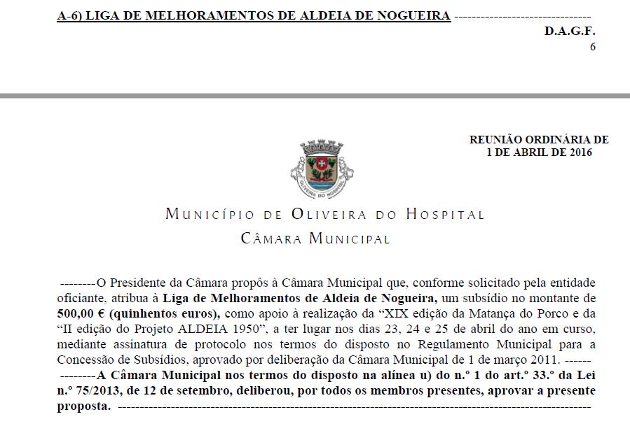 A Câmara Municipal de Oliveira do Hospital revogou um subsídio de 500 euros que tinha atribuído à Liga de Melhoramentos Desporto e Cultura de Aldeia de Nogueira (LMAN) como apoio ao evento “XIX edição da Matança do Porco e da II edição do Projecto ALDEIA 1950” que decorreu nos dias 23 e 24 de Abril. A carta, datada de 13 de Maio e assinada pelo presidente do município, José Carlos Alexandrino, deixou os elementos daquela associação indignados. Descrevem este episódio como insólito e só encontram uma explicação: trata-se de uma retaliação pela postura critica do presidente da instituição, Tozé Cardoso, enquanto munícipe,tem para com o executivo municipal. O vereador do PSD, contactado pelo CBS, garante que ficou atónito quando foi apresentada na reunião de Câmara, de 28 de Abril, a proposta de retirada do subsídio que tinha sido aprovado por unanimidade no dia 1 de Abril.