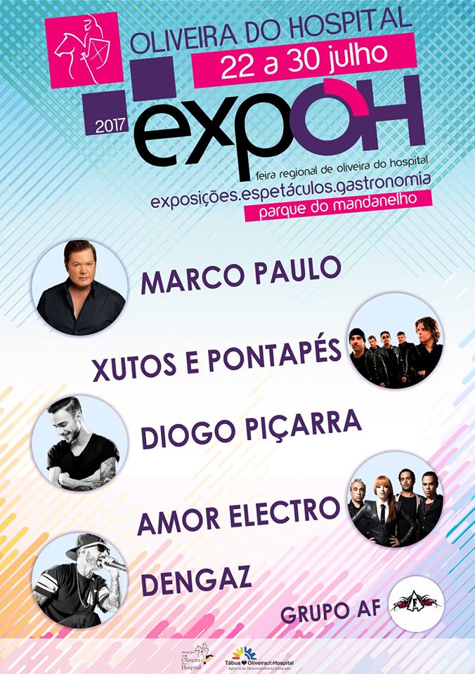 A EXPOH, Feira Regional de Oliveira do Hospital, que este ano decorre de 22 a 30 de Julho (uma semana antes que a do ano passado), vai contar além dos já há muito anunciados Xutos e Pontapés com outros músicos de peso do panorama musical nacional. A autarquia, que optou por divulgar o cartaz com sete meses de antecedência, coloca também no palco do Parque do Mandanelho nomes como os Amor Electro e Marco Paulo (que está a comemorar 50 anos de carreira). Além deste trio, estão também confirmados Diogo Piçarra (venceu a quinta edição do concurso televisivo Ídolos) e Dengaz (um rapper português que conseguiu algum êxito com musicas como “Dizer que Não” e “Nada Errado”, “Rainha” e “Tamojuntos). Do cartaz faz parte também o Grupo AF.