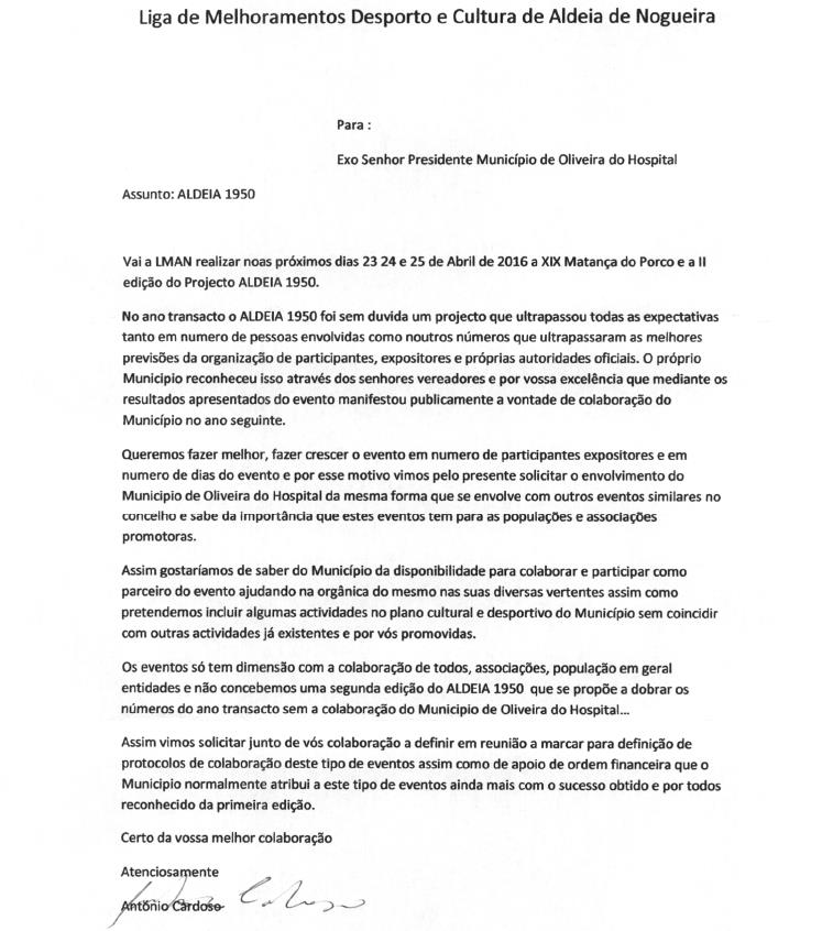 - A Câmara Municipal de Oliveira do Hospital (CMOH) deliberou, na sua reunião de 1 de Abril de 2016, atribuir um subsídio no montante de 500 euros, como apoio à realização da 2ª edição do evento de caráter etnográfico e cultural “ALDEIA 1950”, da Liga de Melhoramentos Desporto e Cultura de Aldeia de Nogueira (LMDCAN);