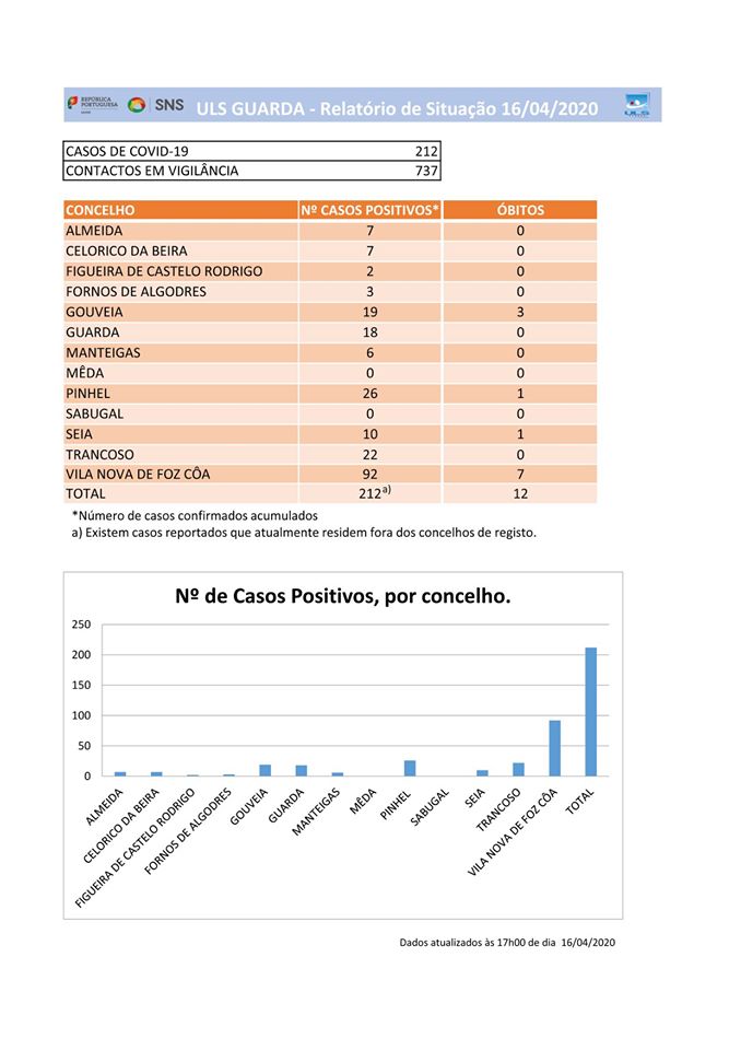 O número de infectados sobe assim para 212 e regista 12 vítimas na área da ULS da Guarda. Há ainda 27 doentes internados, dois dos quais em Unidade de Cuidados Intensivos. Há 158 casos em domicílio. E o relatório de hoje refere ainda que há dez profissionais de saúde infectados. O relatório de situação da ULS da Guarda, enviado aos municípios, ressalva que há casos reportados que actualmente residem fora do concelho de registo.