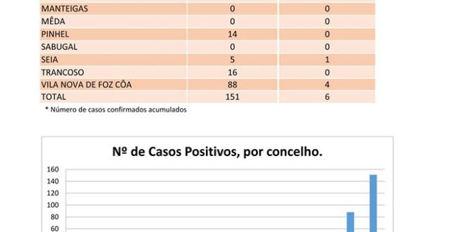 A ULS da Guarda regista na sua área um total de 151 infectados. sendo que Vila Nova de Foz Côa lidera com 88 casos, seguido de Trancoso com 16 (mais 3 casos), Pinhel com 14, Gouveia com 13, Almeida com 7, Seia com cinco e Celorico da Beira com quatro. A região conta já com seis óbitos. A ULS tem ainda 29 casos internados, três casos nos cuidados intensivos e 116 casos em tratamento domiciliário. Há ainda três profissionais de saúde infectados.