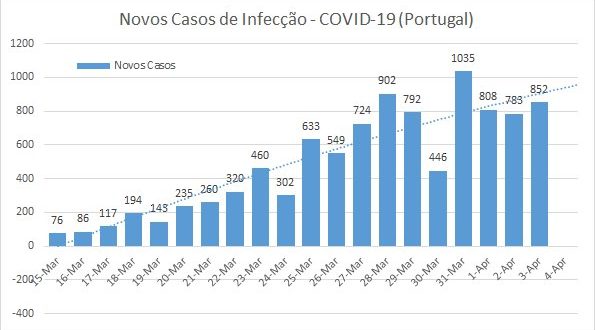 Com o terceiro dia consecutivo na casa dos 800 novos casos (crescimento diário na ordem dos 10%), a Covid-19 aparenta alguma estabilidade. Contudo, é necessário alguma prudência e esperar mais uns dias para confirmar os números e a tendência da evolução epidémica em Portugal. Com a taxa média diária a atingir os 16%, o método indica o alcance do pico no período entre 5 e 12 de Abril. A confirmarem-se estas projecções, estamos perto de passar pela maior evolução diária de novos infectados confirmados.
