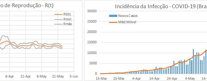 O Brasil atingiu pela primeira vez o valor mínimo de R0 a 14 de Abril, na zona de 1.1. Nessa altura estava com uma média de 1800 novos casos e um total de 25 mil casos acumulados. Desde aí o R0 andou quase sempre acima desse valor, tendo voltado a verificar-se a 15 de Maio, e agora nos últimos dias, mas sempre sem ultrapassar 1.2. Com isto, e apesar de ser um valor baixo, o Brasil encontra-se agora com a média de cerca de 18 mil casos diários e um total acumulado de 450 mil casos e mais de 27 mil mortes.