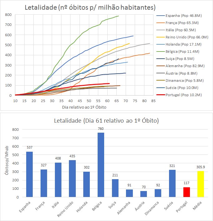 Em termos de incidência comparável por milhão de habitantes, Portugal está agora abaixo da média europeia, com 2803 casos/Mha, e a aproximar-se dos países com menor incidência. Já relativamente à letalidade (nº de casos por milhão de habitante) estamos bem abaixo da média europeia, com 117 casos/Mha, apenas acima Alemanha, da Áustria e da Dinamarca. Mas em termos de taxa de letalidade sobre o número de casos Covid-19 confirmados, estamos apenas acima da Áustria, com 4.2%, tendo sido já ultrapassados pela Alemanha.