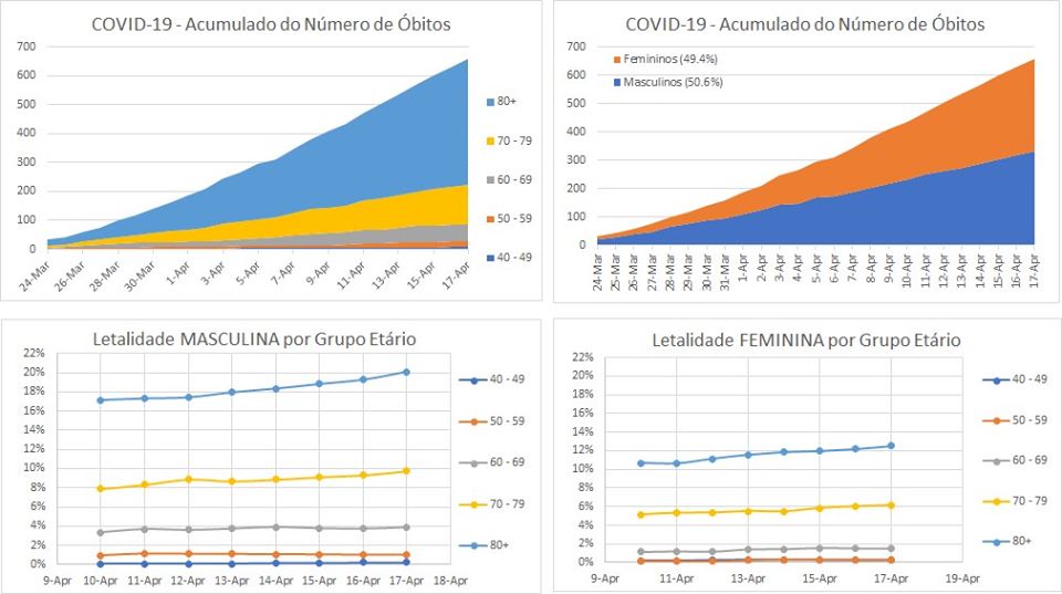 Em Portugal, continuamos a ter uma maior incidência da Covid-19 nas mulheres, 59.1% contra 40.9%. Com os grupos etários de 40 – 59 e 80+ à cabeça, todos acima dos 1900 casos. Já na letalidade, mantém-se uma distribuição por sexo mais ou menos equitativa, embora o grupo etário acima dos 70 anos nos homens apresenta uma taxa muito superior à das mulheres. Com taxas de 10% para 70-79 anos e de 20% para 80+. A taxa nacional de letadidade situa-se agora nos 3.5% dos casos confirmados, abaixo da média europeia (países próximos) que é de 6.9%.