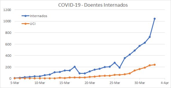 A taxa média de aumento de infectados está agora nos 18%, colocando o pico de novos casos entre 7 e 15 de Abril (estamos a chegar lá, espero), onde se estima um máximo na ordem de 1100 casos diários. Após o qual se espera comece a diminuir. Assim esperamos e desejamos!