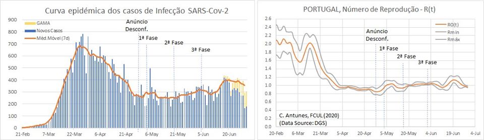 Apenas recentemente pude olhar em mais detalhe e, ao fim de algum trabalho, conseguir estimar a curva epidémica e respectivo número de reprodução, R(t), para a região de Lisboa e Vale do Tejo (LVT) e para a Região Norte (RN). Da análise sobre curva de LVT é impressionante a clareza com se pode verificar o aumento sustentado de casos a partir da data de anúncio do alívio das medidas de confinamento, a 28 de Abril. Desde essa altura que o número de casos não pára de aumentar, dos 100 para a casa dos 300 novos casos. Poucos dias depois, e um pouco antes do início da 1ª fase de desconfinamento, o R(t) ultrapassava o valor de 1.0 e permaneceu acima deste até 11 de Junho. Esteve cerca de 3 dias abaixo, nessa altura, para depois voltar novamente a ultrapassara a barreira.