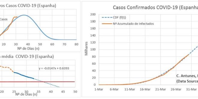 Hoje é também dia de Espanha, pois é o 3º país a ultrapassar a China em número total de infectados. A seguir será a Alemanha daqui a 2 ou 3 dias. Espanha está também a aproximar-se do pico. Esta tendência, a manter-se, levará o número de novos casos a começar a diminuir nos próximos dias. A Espanha apresenta uma taxa de letalidade ao dia de 8.6%, e de 15.4% considerando o atraso de 5 dias.