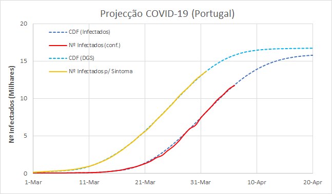 A taxa média de variação diária do números de infectados confirmados está nos 12%, muito perto do threshold dos 10%, o qual coloca o factor de incremento próximo do limiar de 1.0, ou seja, o ponto em que a curva epidémica teórica inverte de sinal – o pico. O reajuste do modelo, baseado numa função densidade de probabilidade (PDF), do tipo exponencial, mostra-nos exactamente a passagem pelo pico, cujo falado “planalto” se terá verificado entre dia 29-Mar e 5-Abr. E isso é verdadeiramente surpreendente, pois tanto se pensava que devido à medidas de contenção e confinamento social, a curva epidémica seria achatada e o pico seria adiado. Algo que deve estar a deixar os epidemiologistas matemáticos verdadeiramente confusos, pois os princípios teóricos não se estão a verificar. Será mesmo assim?