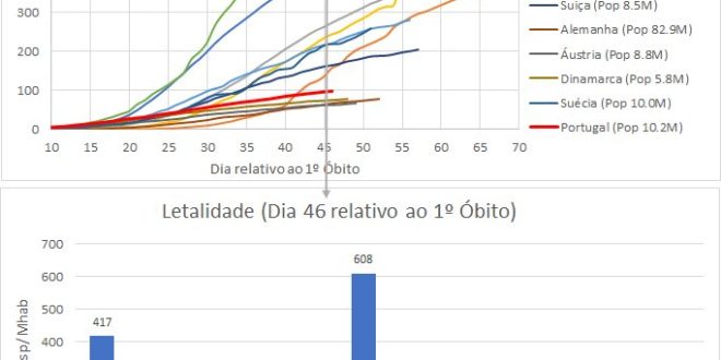 Comparado o 49º dia após o primeiro óbito equivalente de cada país. Portugal, com 97 óbitos por Mha, é apenas ultrapassado (com números mais baixos) pela Alemanha, a Áustria e a Dinamarca (dentro destes 12 países). Já em termos de letalidade percentual é o 3º país com uma taxa mais baixa (melhor que a Dinamarca), de 3.9% de óbitos relativamente ao números de casos confirmados. Embora este indicador esteja sobrestimado, por não se saber o número exacto de infectados incluindo todos os assintomáticos e não diagnosticados. E por outro lado, porque uns países realizam mais testes por Mha que outros. Enquanto que Portugal já realizou mais de 38 mil testes/Mha, a Suécia realizou apenas perto de 12 mil/Mha.