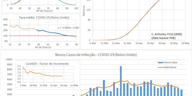 O Reino Unido terá atingido o pico de novos casos a 11 de Abril, quando o factor médio de incremento (estimativa empírica do R(t) com atraso de notificação) ficou abaixo de 1.0. Curiosamente, o pico da curva de novos óbitos com Covid-19 ocorreu no mesmo dia.