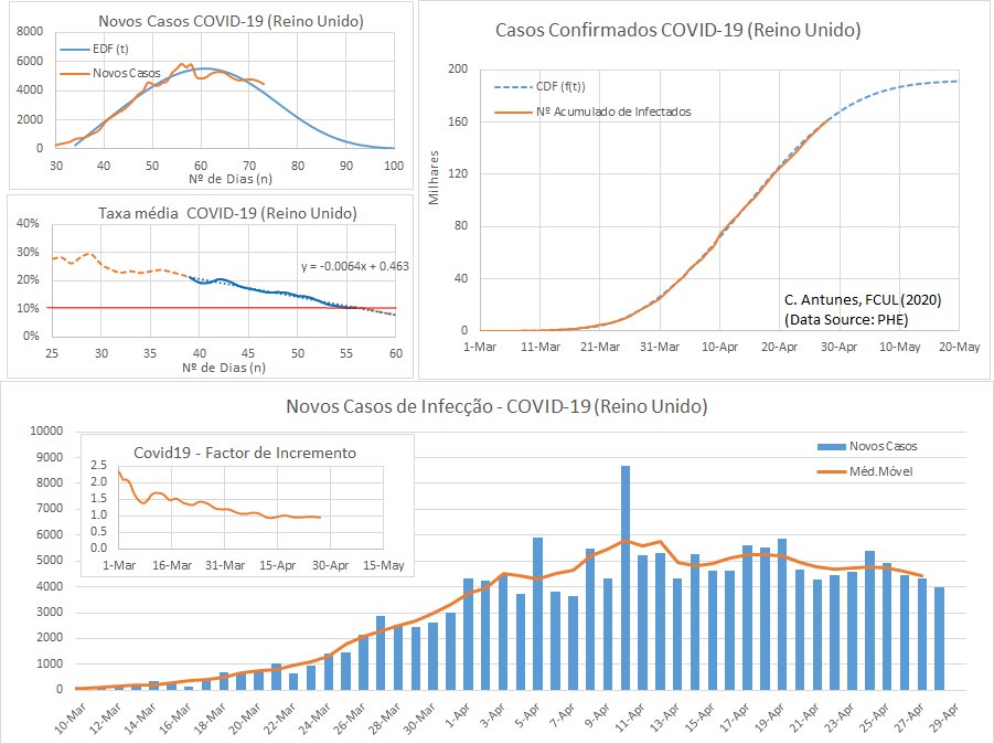 O Reino Unido terá atingido o pico de novos casos a 11 de Abril, quando o factor médio de incremento (estimativa empírica do R(t) com atraso de notificação) ficou abaixo de 1.0. Curiosamente, o pico da curva de novos óbitos com Covid-19 ocorreu no mesmo dia.