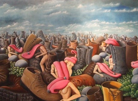 Com uma pintura a óleo, intitulada “No país dos lambe botas”, o pintor, natural de Seia, ironizou na tela um retrato da sociedade portuguesa.