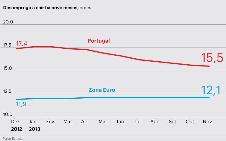 A taxa de desemprego em Portugal voltou a descer em Novembro, pelo nono mês consecutivo, atingindo os 15,5%. Este é o valor mais baixo do último ano. Contudo, a descida face ao mês anterior não é significativa e o desemprego entre os mais jovens aumentou.