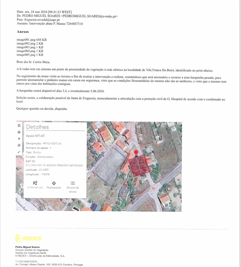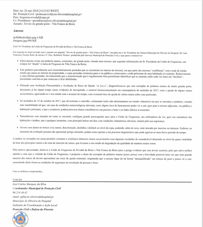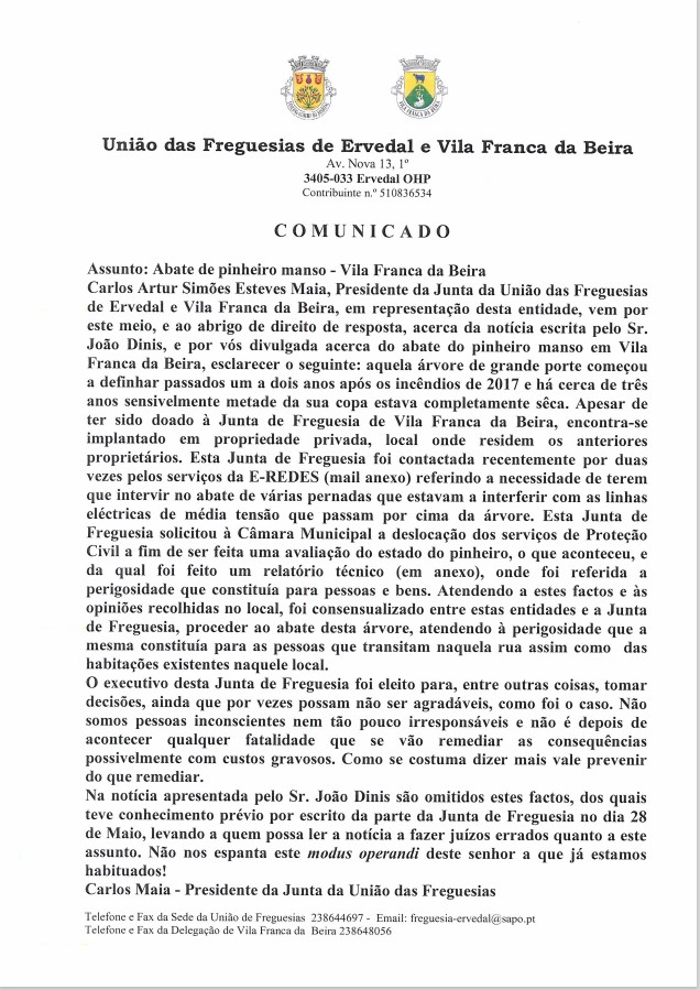 Venho por este meio e ao abrigo do direito de resposta acerca da notícia do Sr. João Dinis quanto ao assunto atrás indicado e por vós divulgado, enviar um comunicado desta Junta de Freguesia quanto a este assunto, assim como comunicação da E-REDES, relatório da Proteção Civil da Câmara Municipal assim como fotografias da referida árvore. Agradecia pois a divulgação destes elementos a fim de esclarecer melhor a opinião pública quanto à verdade dos factos.