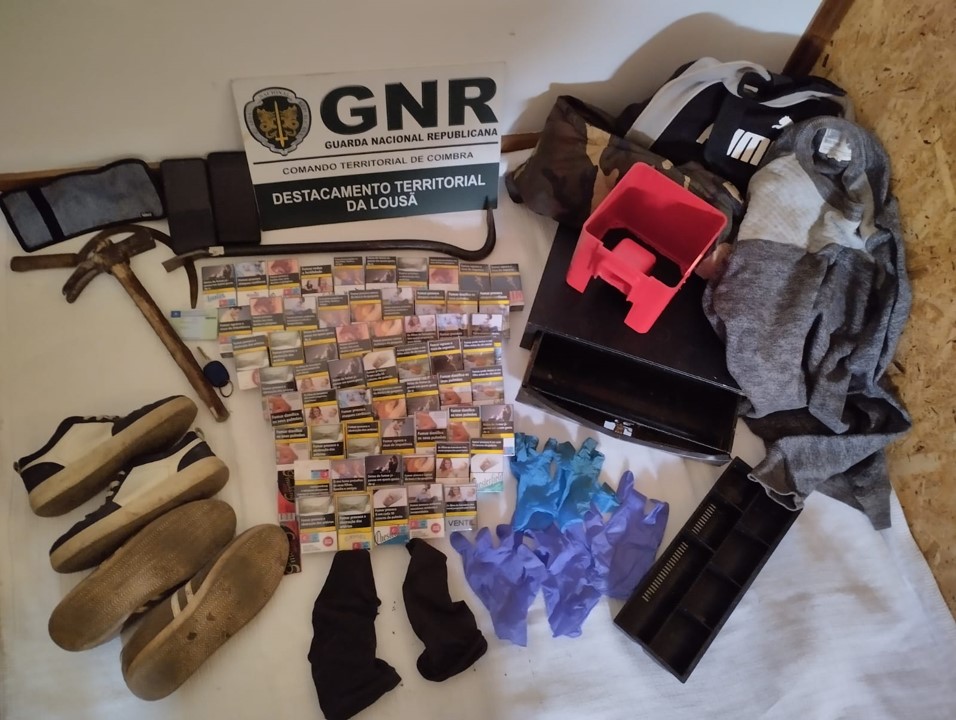 No decorrer da acção, foram realizadas buscas domiciliárias às residências dos suspeitos, tendo sido possível apreender o seguinte material: 59 maços de tabaco, três pares de ténis, duas gavetas de caixa registadora, dois telemóveis, um gorro, um martelo, um pé de cabra, um casaco, uma camisola, uma mochila, uma viatura e diversas peças de um dispensador de bolas.