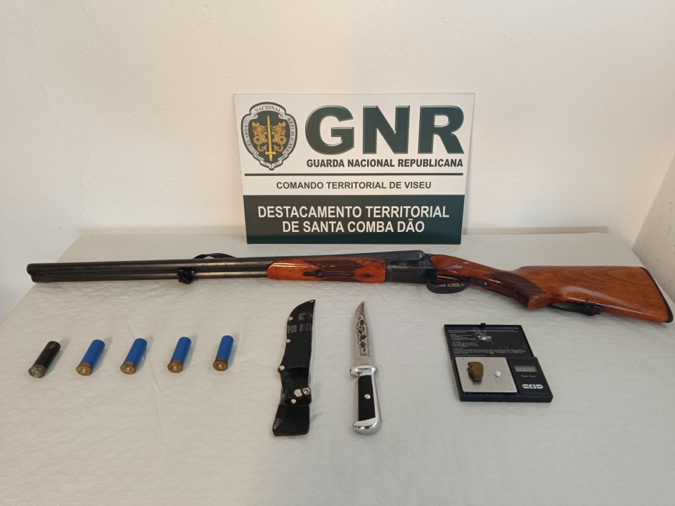 A GNR de Carregal do Sal, no âmbito de uma denúncia por posse ilegal de armas e munições, deteve, na segunda-feira, dois homens de 34 e 72 anos no concelho de Carregal do Sal. As detenções aconteceram depois dos militares da Guarda terem efectuado diversas diligências policiais, que culminaram na realização de duas buscas domiciliárias. Na sequência das diligências foi apreendido o seguinte material: uma caçadeira; quatro cartuchos; um punhal; sete doses de haxixe; 0,55 doses de cocaína; uma balança de precisão.