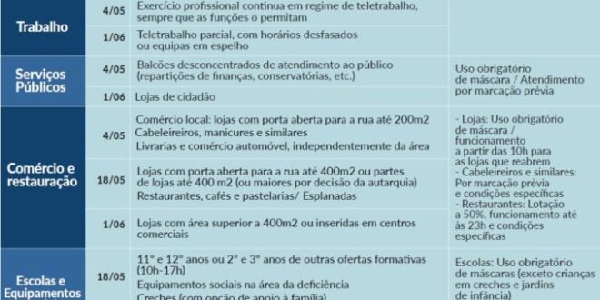 Eis o plano de desconfinamento…plano de desconfinamento aprovado pelo Governo esta quinta-feira e que vai começar a ser implementado a partir da próxima segunda-feira, dia 4 de maio, foi apresentado esta quinta-feira pelo primeiro-ministro, António Costa. Portugal vai regressar à normalidade em três fases, a primeira arranca a 4 de maio, a segunda 18 de maio e a terceira e última a 1 de junho.