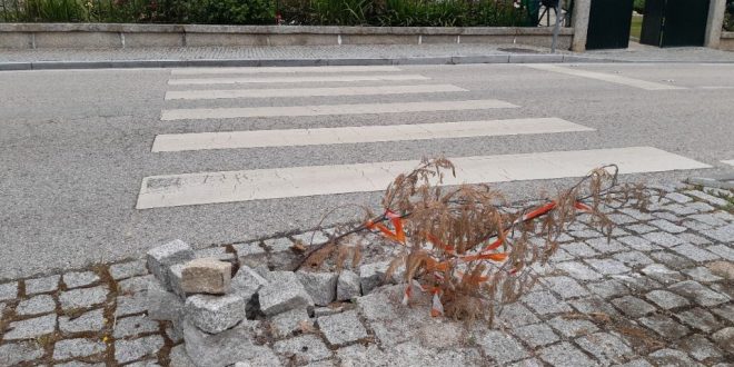 Decerto por orientação da autarquia, retiraram do seu sítio normal uns 12 paralelos – para reintroduzir um “pino” metálico a delimitar espaço? – mas os paralelos amontoados e o buraco ficaram abandonados e já lá vão muitos dias seguidos.  Uma “alma previdente” colocou umas pernadas de mimosas nesse buraco e enfeitou-as com umas fitas plásticas traçadas a branco e vermelho, a assinalar o obstáculo…