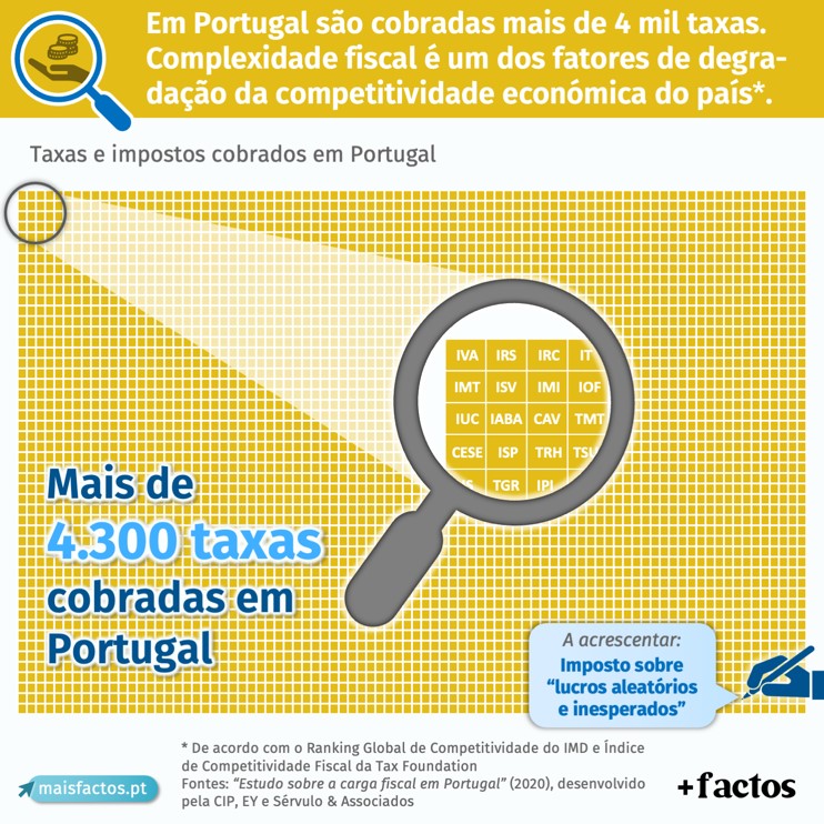 Os estudos internacionais alertam que a complexidade tributária que incide sobre as empresas e famílias em Portugal afeta significativamente a competitividade da economia portuguesa. A Tax Foundation, no Índice de Competitividade Fiscal, avalia o sistema fiscal português como o quarto menos competitivo da OCDE (entre 37 países). Por outro lado, o International Institute for Management Development (IMD), no seu Ranking Global de Competitividade 2021, coloca Portugal na 53.ª posição em termos de política fiscal entre 64 países (no índice global, Portugal ocupa a 36.ª posição).