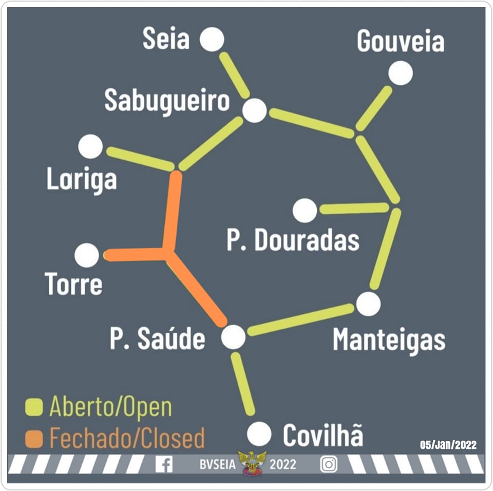 As estradas com destino à Torre na Serra da Estrela estão fechadas desde as 19h00 devido à queda de neve. Segundo os bombeiros de Seia, estão encerrados desde aquela hora, os troços Piornos – Torre – Lagoa Comprida, na estrada de acesso ao maciço central da Serra da Estrela. “Respeite as baias de segurança e siga as recomendações das autoridades”, refere
