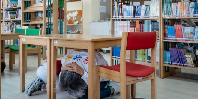 À hora marcada do exercício, que ocorreu à escala nacional, a campainha da escola tocou duas vezes e os estudantes e professores seguiram três gestos simples: baixar, proteger e aguardar. Colocaram-se debaixo das mesas, protegeram a zona do pescoço e aguardaram um minuto, o tempo da actividade, seguindo, assim, as recomendações que receberam sobre como agir antes, durante e depois da ocorrência de um sismo.