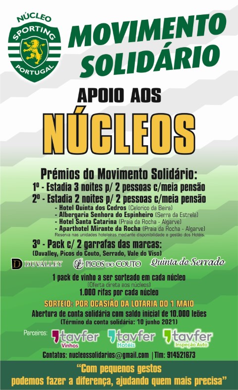 , patrocinado pelo Grupo TAVFER.“Os núcleos são sempre um dos maiores elos de ligação do exterior e apoio ao nosso Sporting CP, nunca esquecendo mesmo quando os resultados desportivos não eram os melhores”, explicam, adiantando que os núcleos têm dado sempre o apoio incondicional à equipa . Assim como continuam a dar e a apoiar, onde quer que se desloquem, para que o bom nome e os resultados do Sporting Clube de Portugal sejam sempre aqueles que todos os sportinguistas, de bem, pretendem, que são as vitórias”, rematam.