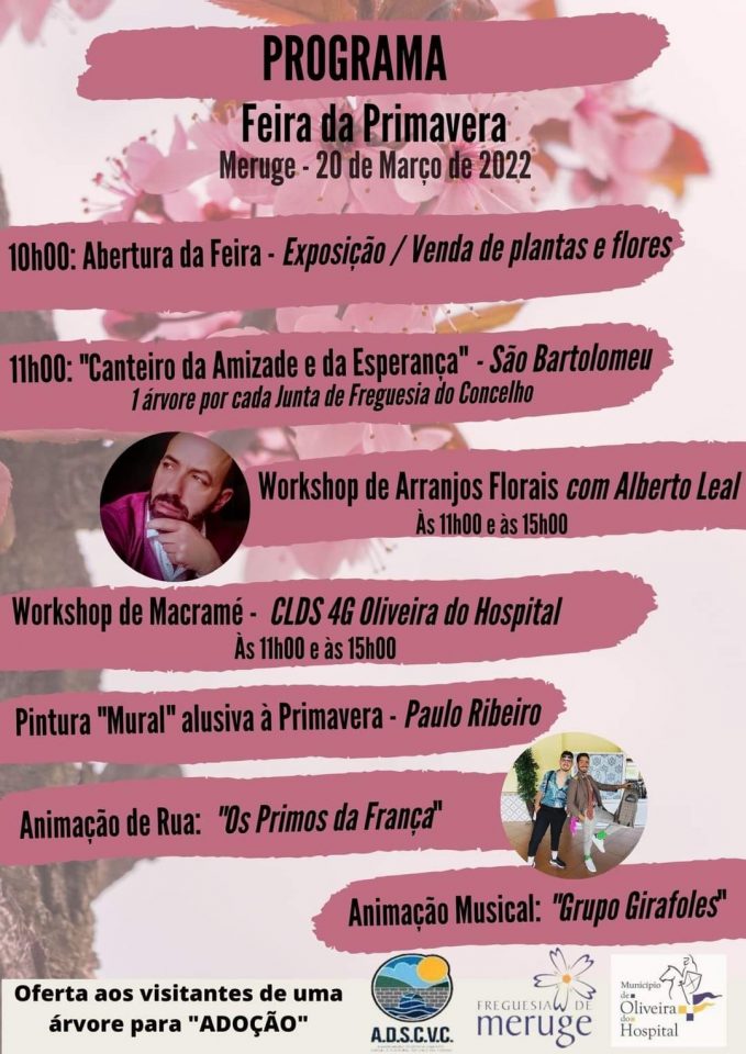 A Feira da Primavera regressa no próximo dia 20 de Março a Meruge, concelho de Oliveira do Hospital, três anos depois de ter sido interrompida devido à pandemia da COVID 19. Trata-se de um evento singular e ecológico com palco no Terreiro do Santo e que nesta edição conta com novas valências e dinâmicas. Uma forma diferente de assinalar o regresso da Primavera, numa iniciativa que procura lembrar também o dos incêndios com o canteiro da Amizade e da Esperança, em que cada uma das 16 freguesias do concelho deverá plantar uma árvore, ou a iniciativa venha adoptar uma árvore.