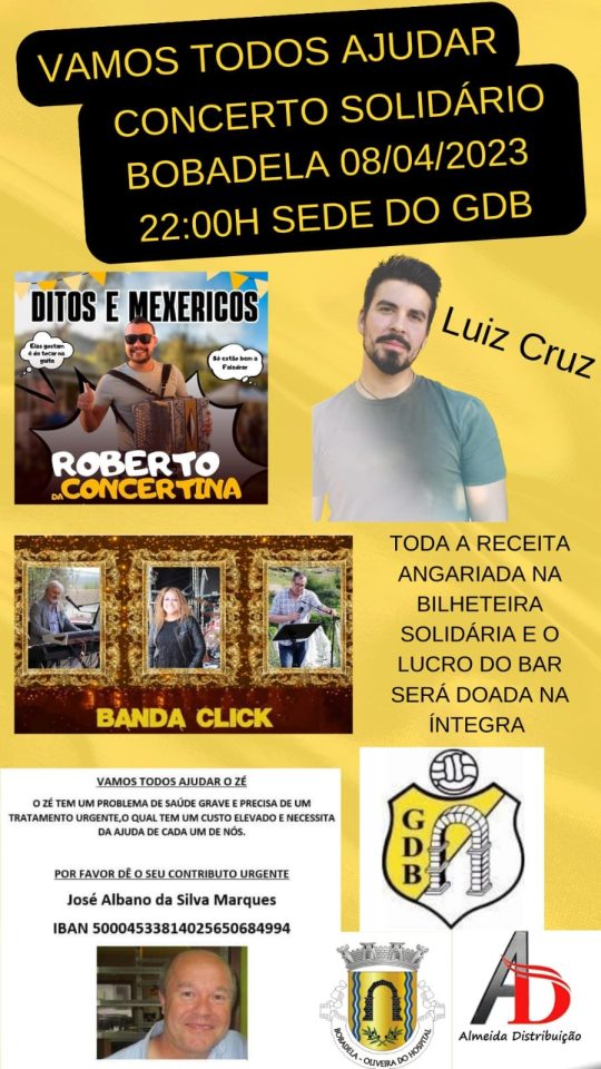 “Toda a receita reverte para a causa que visa reunir o dinheiro necessário para que o José consiga realizar os tratamentos”, explica Luís Moreira que organizou este evento de forma apressada dada a urgência dos tratamentos necessários para o “Russo”. “Mas os artistas mostraram de imediato a sua disponibilidade, o que facilitou tudo. Tenho de salientar que todos eles responderem sem qualquer hesitação ao convite. Assim como o GD Bobadelense e a Junta de Freguesia da Bobadela. Espero que o evento tenha também a mesma adesão por parte do público porque o José Albano Marques merece”, rematou o promotor de espectáculos oliveirense.