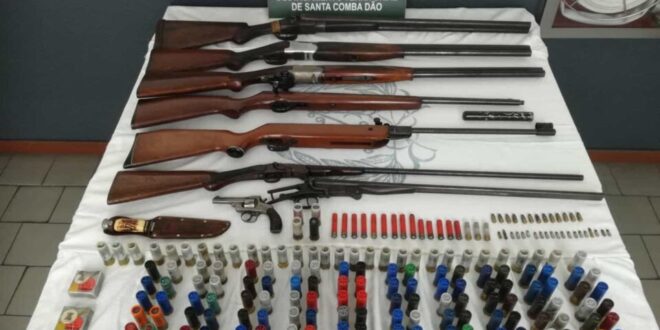 “Três espingardas, duas carabinas, uma arma de ar comprimido, um revólver, um silenciador, um punhal, 191 cartuchos de diversos calibres, 33 munições de diversos calibres e duas caixas de 250 chumbos“. O suspeito foi constituído arguido e os factos remetidos ao Tribunal Judicial de Tondela.