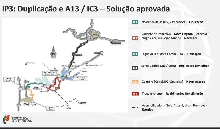 De acordo com a informação divulgada pelo governante, a primeira fase deverá estar concluída no final de 2027, enquanto a última está prevista para cerca de sete anos depois. O Ministério das Infra-estruturas esclarece, no entanto, que não está incluída neste calendário a ligação entre o IP3, em Souselas, e a A13, no nó de Ceira, uma intervenção que tem sido reivindicada pelos autarcas da região. Essa ligação permitiria uma continuidade em perfil de auto-estrada entre Lisboa e Viseu, e também para Vila Real e Chaves através da A24, beneficiando da actual isenção de portagens na A23 e na A13.