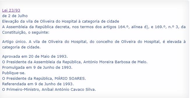 Faz hoje precisamente um quarto de século que a Assembleia da República aprovou a lei que elevou a vila de Oliveira do Hospital à categoria de cidade. O documento foi aprovado a 20 de Maio de 1993, foi promulgado a 9 de Junho e publicado a 2 de Julho, durante a presidência de Mário Soares e numa altura em que cargo de Primeiro-ministro era ocupado por Cavaco Silva.