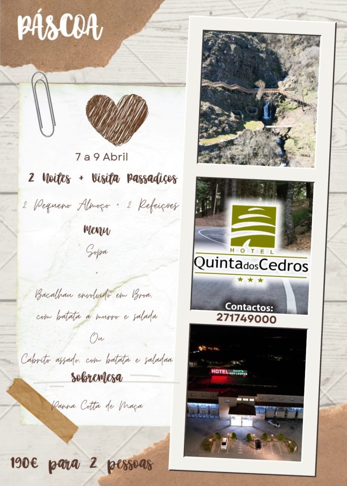 O hotel Quinta dos Cedros localizado em Celorico da Beira, a 20 minutos das três entradas para os Passadiços do Mondego, lançou uma campanha de Páscoa para duas pessoas, para o fim-de-semana de Páscoa que inclui uma visita àqueles que são considerados a grande atracção turística da região. “O hotel pretende mostrar aos seus clientes a boa gastronomia da região e um dos pontos mais procurados nesta altura na Serra da Estrela”, refere uma nota da unidade hoteleira.