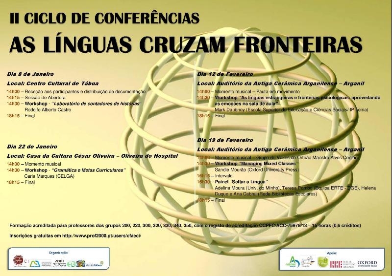 Depois de uma primeira sessão em Tábua, no dia 8 de janeiro, a Casa da Cultura César Oliveira, na cidade de Oliveira do Hospital, acolhe o segundo encontro, a partir das 14h00, em que será desenvolvido um workshop sobre “Gramática e Metas Curriculares” orientado por Carla Marques do CELGA (Centro de Estudos de Linguística Geral e Aplicada) da Universidade de Coimbra. O Ciclo de Conferências terá continuidade nos dias 12 e 19 de fevereiro no Auditório da Antiga Cerâmica Arganilense em Arganil.