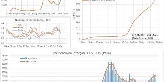 Com o Rt acima de 1.0 desde 18-Fev, quando tinha uma média de 12 mil casos diários (274 casos por 100kh a 14 dias), tem agora uma média acima de 20 mil casos diários (445 casos por 100kh) com uma aumento médio diário a uma taxa de 2.3%.