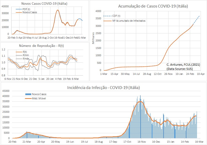 Com o Rt acima de 1.0 desde 18-Fev, quando tinha uma média de 12 mil casos diários (274 casos por 100kh a 14 dias), tem agora uma média acima de 20 mil casos diários (445 casos por 100kh) com uma aumento médio diário a uma taxa de 2.3%.
