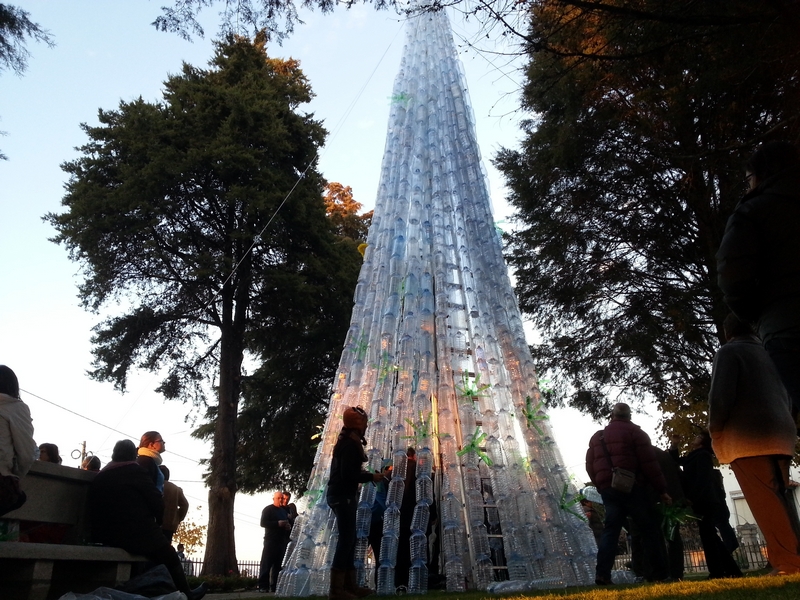 Para a construção da árvore de Natal foram necessários cerca de 2500 garrafões e garrafas que deram forma aos 11 metros de “união e ecologia”, adiantam os jovens que já enviaram a candidatura para o Guinness World Records para averiguar o seu impacto mundial.