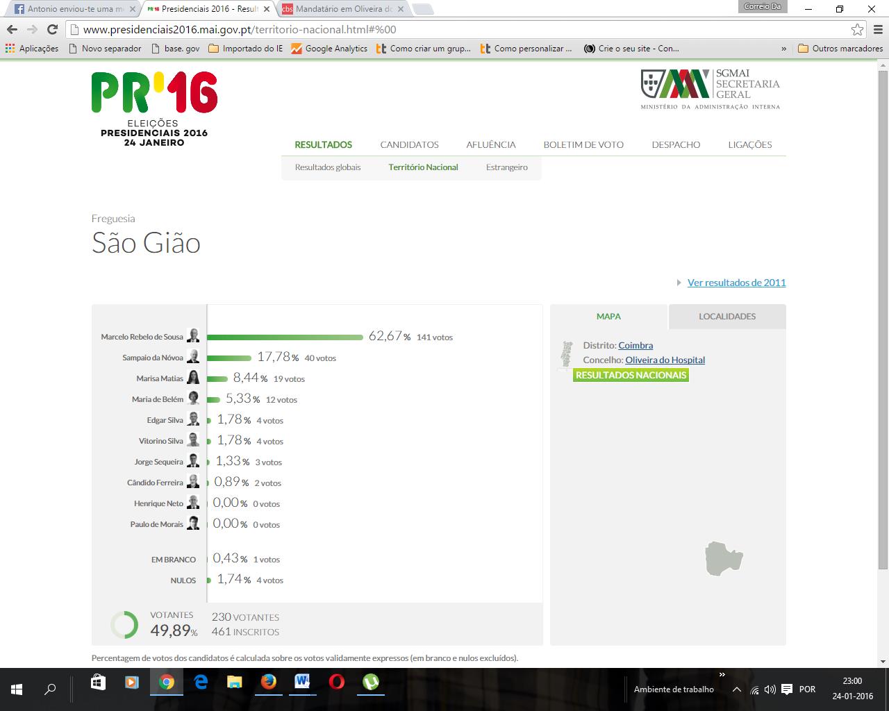 Marcelo Rebelo de Sousa venceu no concelho de Oliveira do Hospital com 63,57 por cento dos votos, contra 18,90 por cento de Sampaio da Nóvoa. Venceu também em todas as freguesias. Marisa Matias conseguiu 6,99 e Maria de Belém 4,77 por cento. Seixo da Beira foi onde Marcelo conseguiu a vitória mais dilatada ao atingir 72,93 por cento dos eleitores. Já o seu pior resultado foi conseguido em Alvôco onde somou apenas 38,27 contra 35,19 por cento de Sampaio da Nóvoa. Destaque ainda para o resultado de Vitorino Silva em Travanca onde arrecadou o quarto lugar com 3,67 por cento dos votos, logo atrás de Marisa Matias (7,99 por cento).